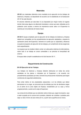 El documento describe los procedimientos para el desbroce y limpieza de zonas no boscosas para proyectos viales. Establece que este trabajo incluye la remoción de vegetación, escombros y raíces para dejar el terreno limpio. También especifica cómo deben disponerse y quemarse los materiales removidos y que el contratista es responsable de obtener los permisos requeridos y evitar daños ambientales. El pago por este trabajo se realizará por hectárea desbrozada y limpiada satisfactoriamente.