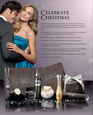 Este documento presenta varios productos de belleza y fragancias de la marca LR para las fiestas navideñas. Incluye nuevas colecciones de bisutería, relojes y accesorios para el hogar, así como ofertas limitadas de cosméticos y suplementos alimenticios. También promociona sets navideños de fragancias populares como Heidi Klum, Desperate Housewives y Leona Lewis en precios reducidos. El documento desea a los lectores felices fiestas.