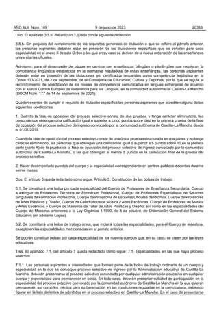Este documento modifica la orden que regula la constitución y gestión de las bolsas de trabajo del personal docente interino en Castilla-La Mancha. Se realizan cambios como actualizar el anexo de titulaciones requeridas, adaptar la orden a los últimos procesos selectivos y pactos sindicales, y modificar aspectos sobre la permanencia en bolsa tras los procesos selectivos. Se crean bolsas de reserva para aspirantes no seleccionados y se ordenan las bolsas exclusivamente por la nota obtenida en el proceso selectivo correspondiente.
