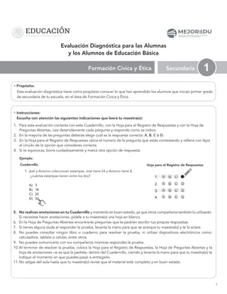 Este documento presenta 11 preguntas de una evaluación diagnóstica de Formación Cívica y Ética para alumnos de primer grado de secundaria. Las preguntas abordan temas como el respeto a la dignidad humana, los derechos humanos, la solidaridad, la justicia y la toma de decisiones éticas. El documento incluye instrucciones para que los estudiantes respondan correctamente las preguntas.