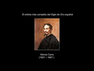 Alonso Cano (1601-1667) fue el artista más completo del Siglo de Oro español, destacando como pintor, dibujante, grabador, retablista, diseñador, arquitecto y escultor. Se formó en el taller de Francisco Pacheco y conoció a artistas como Velázquez y Zurbarán. Su obra refleja influencias renacentistas y venecianas. Como escultor, su obra más importante fue la Inmaculada Concepción de la Catedral de Granada. También destacó como arquitecto, dise