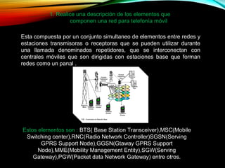 Este documento describe los principales elementos que componen una red para telefonía móvil, incluyendo estaciones base, controladores de red de radio, centros conmutadores móviles, registradores de ubicación del visitante y del hogar, nodos de soporte GPRS, y pasarelas GPRS. Explica brevemente el propósito y función de cada elemento clave en la interconexión y entrega de servicios de voz y datos a usuarios móviles.