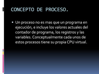 Un proceso es un programa en ejecución que incluye el estado actual del programa como los valores de los registros y variables. Un proceso tiene varios estados como ejecutándose, listo o bloqueado. Dentro de un proceso pueden existir hilos o hebras ligeras que comparten los recursos del proceso pero tienen su propia unidad de ejecución asignada por el CPU.