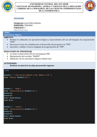 Este documento presenta un informe de una práctica realizada sobre operadores lógicos en PHP. El objetivo fue aprender a utilizar variables y operadores lógicos en PHP. Las actividades incluyeron ejercicios de suma, resta, multiplicación y división utilizando variables numéricas y mostrando los resultados. El informe muestra capturas del programa funcionando correctamente.