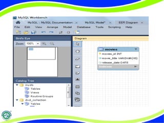 Este documento describe cómo crear y modificar una base de datos en MySQL. Explica cómo crear una base de datos usando la sentencia SQL CREATE y cómo diseñar el esquema de una base de datos usando herramientas como MySQL Workbench. También describe los diferentes niveles de esquema de una base de datos y cómo crear y guardar un modelo de base de datos en MySQL Workbench.