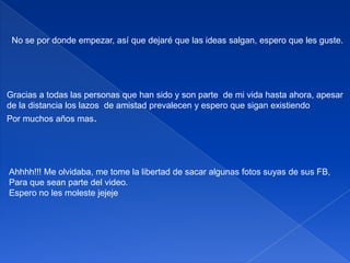 Este documento es una carta de agradecimiento a varias personas importantes en la vida del autor. En menos de 3 oraciones, agradece a amigos, familiares y otras personas significativas por su apoyo y por formar parte de su vida, ya sea por un tiempo o de manera permanente. Reconoce que a pesar de la distancia, los lazos de amistad perduran.