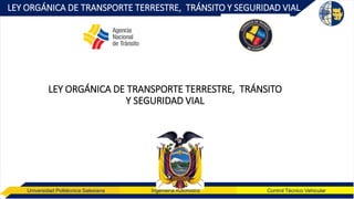 El documento resume los principales puntos de la Ley Orgánica de Transporte Terrestre, Tránsito y Seguridad Vial de Ecuador. La ley tiene como objetivos la organización, planificación, fomento, modernización y control del transporte terrestre para proteger a las personas y bienes que se transportan. El Estado garantiza el derecho al libre tránsito y transporte público seguro, eficiente y de calidad. También es responsabilidad del Estado controlar la capacitación de conductores y exigir el cumplimiento de normas de seguridad vial.