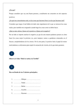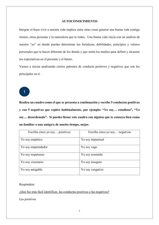 Este documento trata sobre el autoconocimiento y la imagen personal como parte de vivir bien. Explica que para vivir bien es importante analizar las propias fortalezas, debilidades, valores y patrones de conducta, tanto positivos como negativos. También habla sobre la importancia de enfocarse más en los aspectos y talentos positivos que en los negativos. Finalmente, analiza cómo la percepción de la propia imagen corporal está influenciada por la opinión de los demás y los medios de comunicación.