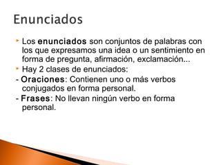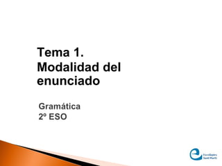 El documento habla sobre la modalidad de los enunciados. Explica que los enunciados son conjuntos de palabras que expresan una idea y que pueden ser oraciones o frases. Además, detalla los diferentes tipos de modalidad de enunciado, incluyendo enunciativas, interrogativas, exclamativas, dubitativas, optativas, exhortativas y de posibilidad. Por último, señala que los indicadores de modalidad incluyen la entonación, las formas verbales y determinados adverbios.