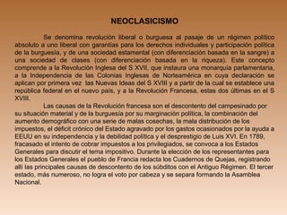 La revolución francesa ocurrió en el siglo 18 y transformó Francia de una monarquía absoluta a una república. Fue causada por el descontento del campesinado y la burguesía con el Antiguo Régimen y sus desigualdades. La revolución estableció derechos individuales, abolió privilegios feudales y estableció una monarquía constitucional, aunque luego se volvió más radical bajo el control de los jacobinos. Napoleón luego tomó el poder e impuso un régimen de gobierno más