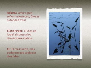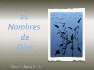 Este documento lista y describe 21 nombres de Dios en hebreo y sus significados. Algunos de los nombres más destacados son: Elohim (el Creador todopoderoso), Jehová (Yo Soy, el que es autoexistente), El-Shaddai (el todo suficiente, Dios Todopoderoso), y Jehová-Jireh (el Señor proveerá). Cada nombre revela un aspecto diferente del carácter y la naturaleza de Dios.