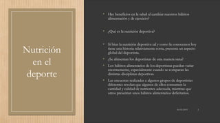 El documento explora la relación entre la nutrición y el rendimiento deportivo, destacando la importancia de una alimentación equilibrada y adecuada para los deportistas. Se aborda el impacto de las ayudas ergogénicas, la charlatanería nutricional y las estrategias de alimentación antes de competencias, así como la necesidad de hidratación y el uso de suplementos nutricionales. Además, se menciona la evolución de la nutrición deportiva y su aplicación en diferentes disciplinas.