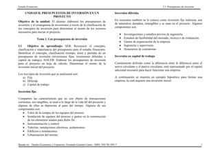 Este documento describe los tres tipos de inversión necesarios para iniciar un proyecto: inversión fija, inversión diferida y capital de trabajo. La inversión fija incluye equipos, instalaciones y edificios. La inversión diferida incluye estudios, capacitación y marketing. El capital de trabajo cubre gastos operativos como sueldos, servicios y suministros. Se provee un ejemplo numérico que suma $204,300 para las tres inversiones iniciales de una pequeña empresa de alimentos. Los estudiantes deben elaborar los presupuest