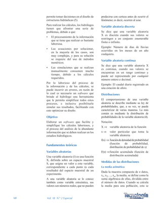 Este documento describe un software llamado HidroEsta que facilita cálculos hidrológicos. El software permite calcular parámetros estadísticos, regresiones, ajustes a distribuciones de probabilidad, eventos de diseño, análisis de tormentas, aforos, caudales máximos, evapotranspiración y balances hídricos. El software provee una herramienta útil para ingenieros e hidrólogos que requieren realizar cálculos hidrológicos.