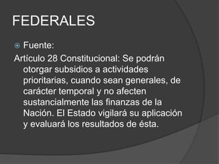 Este documento resume varios incentivos federales, estatales y municipales para la inversión extranjera en México. A nivel federal, destacan el Fondo Prosoft para proyectos de software, el programa de primer empleo que subsidia cuotas obrero-patronales por 12 meses, e IMMEX para importación temporal de mercancías. Los estados ofrecen agendas de negocios, contactos gubernamentales y reducciones de impuestos sobre la nómina. Los municipios reducen impuestos a la adquisición e inmuebles y a la propiedad in