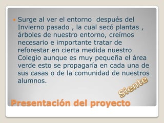 El documento describe un proyecto de reforestación en un colegio. El proyecto busca rescatar y cuidar los árboles en el colegio, hacer conciencia sobre la importancia de los árboles, e involucrar a los alumnos plantando árboles en sus casas. El proyecto incluye actividades como investigar especies de árboles locales, crear materiales promocionales, recolectar latas para fondos, y exhibiciones de trabajos de los alumnos sobre árboles.