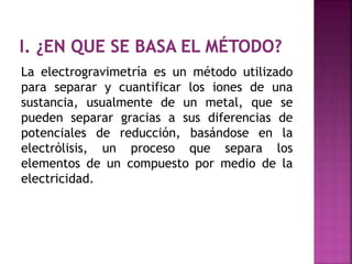 El documento describe el método de electrogravimetría para separar y cuantificar iones en una sustancia mediante electrolisis. La electrogravimetría consiste en electrolizar una muestra y depositar los iones cuantitativamente en los electrodos. El metal depositado en el cátodo se pesa antes y después para calcular la cantidad original en la muestra. La técnica se puede usar con o sin control de potencial y permite determinar varios metales como cobre, plata y zinc.