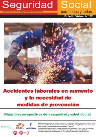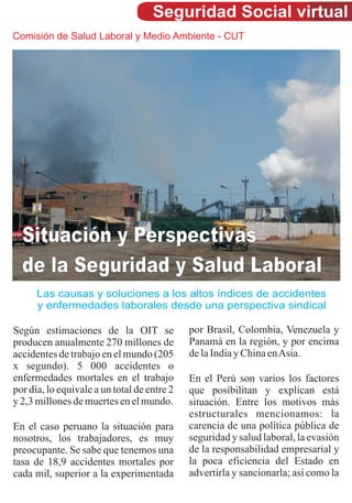 Este documento discute la alta tasa de accidentes laborales en Perú y las causas subyacentes, como la falta de una política pública sólida de seguridad y salud laboral, la evasión de responsabilidad de los empleadores y la cobertura limitada del sistema de seguros. En los últimos años, se han registrado aumentos en el número de accidentes laborales atendidos, con 700 obreros de la construcción que sufrieron accidentes solo en los últimos 12 meses. Se necesita una reforma integral para universalizar la cobertura y promover una cultura más fuerte