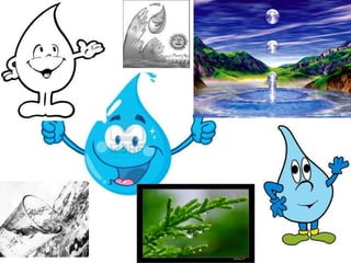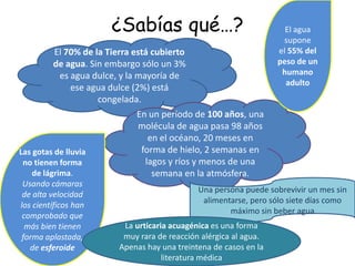 El documento proporciona información sobre el agua y su importancia. Menciona que el 70% de la Tierra está cubierta de agua, pero sólo un 3% es agua dulce. Además, señala que una persona puede sobrevivir un mes sin comer pero sólo una semana sin beber agua, destacando la importancia vital del agua para los seres humanos.