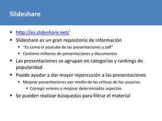 Slideshare es una plataforma para compartir y distribuir documentos en línea como presentaciones y archivos PDF. Los usuarios pueden subir, comentar, valorar y descargar presentaciones de otros o compartir las suyas propias. Slideshare ofrece estadísticas de visualizaciones y descargas y permite agrupar presentaciones por categorías y rankings de popularidad.