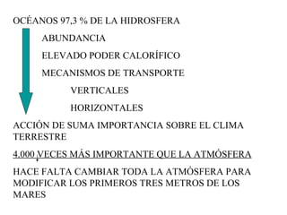El documento describe los océanos y su importancia para el clima de la Tierra. Los océanos absorben y almacenan grandes cantidades de calor y regulan la temperatura global. Las corrientes oceánicas transportan calor por todo el planeta y juegan un papel clave en el clima. La Corriente del Golfo mantiene el clima cálido de Europa. Sin embargo, el calentamiento global está debilitando esta corriente, lo que podría enfriar el clima europeo en el futuro.