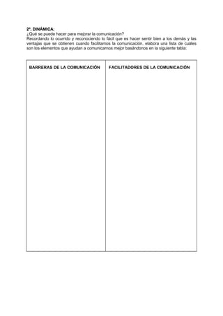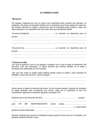 El documento presenta una actividad para parejas sobre la comunicación entre padres e hijos. Los participantes deben elegir un objeto valioso y explicar por qué lo necesitan, practicando luego la comunicación efectiva de necesidades siguiendo el formato "entendiendo al otro pero expresando las propias necesidades". El objetivo es que aprendan a mejorar la comunicación reconociendo las barreras y facilitadores.