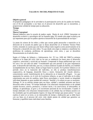 Este taller para padres tiene como objetivo ayudarlos a comprender mejor el desarrollo de sus hijos en la primera infancia y brindarles pautas de crianza positivas. Consiste en cuatro actividades como dinámicas de presentación, aprendizaje de la autonomía, identificación de estrategias útiles y el uso de fichas de reforzamiento. El taller busca que los padres apoyen a sus hijos a enfrentar desafíos comunes de esa edad de manera adecuada.