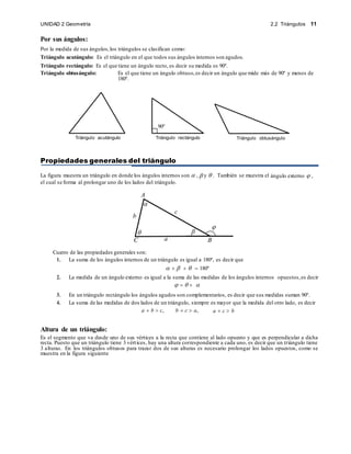 Este documento presenta conceptos básicos sobre triángulos, incluyendo definiciones, clasificaciones, propiedades y teoremas. Explica cómo calcular el área, perímetro y lados de triángulos utilizando relaciones entre ángulos, alturas y el teorema de Pitágoras. También cubre conceptos como triángulos semejantes y cómo resolver problemas geométricos usando estas herramientas.