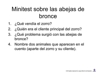 El documento presenta un resumen de un cuento llamado "Las abejas de bronce" de Marco Denevi. Se detalla una lección sobre el cuento, incluyendo preguntas de comprensión, discusión de partes graciosas y una crítica, actividades de vocabulario y un ejercicio de role play sobre el tema central del cuento.