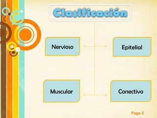Este documento resume los principales tipos de tejidos del cuerpo humano: epitelial, conectivo, nervioso y muscular. Explica que el tejido epitelial está compuesto de células unidas que cubren superficies internas y externas. El tejido conectivo incluye tejido conectivo no especializado como laxo y denso, y tejido conectivo especializado como adiposo, cartilaginoso, óseo y hematopoyético. El tejido nervioso está compuesto de neuronas que son excitables y conductoras.