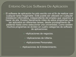 El documento contiene información sobre diferentes tipos de software de aplicación como aplicaciones de negocios, utilería, personales y entretenimiento. También describe elementos gráficos como objetos de dibujo e imágenes que pueden usarse para mejorar documentos de Microsoft Word. Explica cómo usar el corrector ortográfico incluido para escribir correctamente en español.