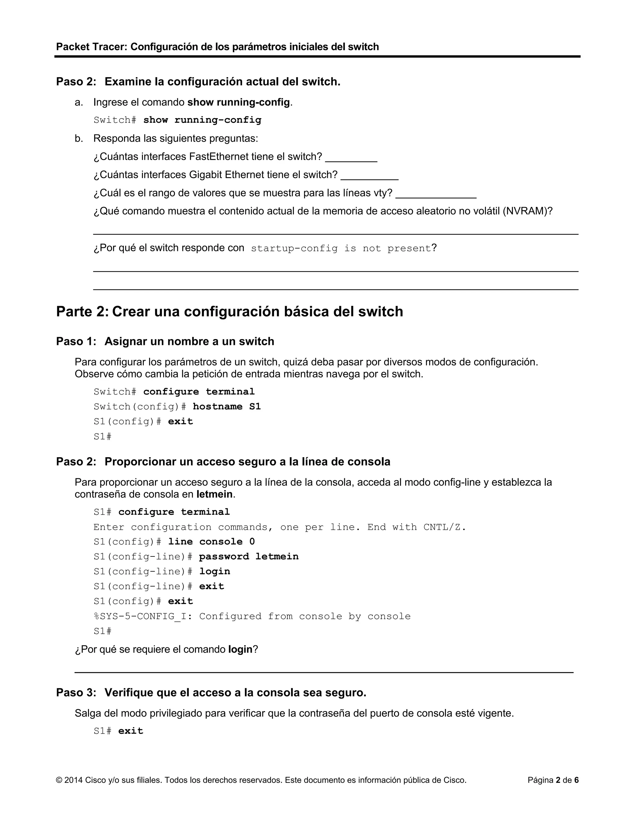 Este documento proporciona instrucciones para configurar parámetros básicos en dos switches, incluyendo asignar nombres a los switches, establecer contraseñas de acceso seguro, configurar mensajes que se muestran a los usuarios y guardar la configuración. Se explican cinco partes: verificar la configuración predeterminada, crear una configuración básica, configurar un mensaje del día, guardar la configuración y configurar el segundo switch.
