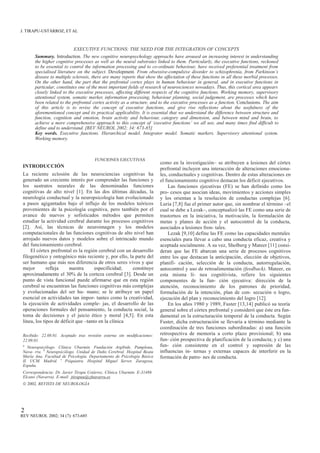 Este documento resume un artículo de revisión sobre las funciones ejecutivas. El artículo discute los diferentes modelos y definiciones de las funciones ejecutivas y la necesidad de una conceptualización más integrada. También explora las relaciones entre las funciones ejecutivas, la memoria de trabajo, el córtex prefrontal y diferentes trastornos neurológicos y psiquiátricos. El objetivo es revisar el concepto de funciones ejecutivas y reflexionar sobre su utilidad y aplicabilidad práctica.