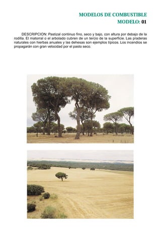 Este documento presenta 13 modelos de combustible que describen diferentes tipos de vegetación y su comportamiento ante el fuego. Los modelos van desde pastizales y matorrales bajos hasta bosques densos con varios tipos de restos leñosos, describiendo cómo se propagará el fuego y su intensidad en cada caso. El documento proporciona información sobre la velocidad de propagación, la intensidad y el largo de las llamas esperados para cada modelo, en función de factores como la humedad y continuidad del combustible.