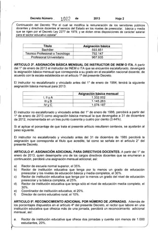 Este decreto modifica la remuneración de los docentes y directivos docentes al servicio del Estado en Colombia en los niveles de preescolar, básica y media. Establece nuevas asignaciones básicas mensuales para los grados del escalafón docente, así como para educadores no escalafonados. También determina asignaciones adicionales para directivos docentes, supervisores, instructores y docentes de preescolar, así como primas académicas, auxilios de movilización y transporte, y prima de alimentación.
