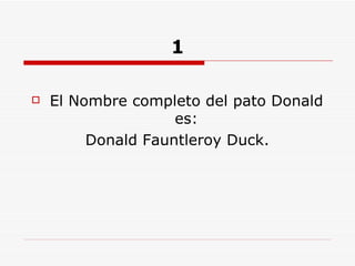 1 El Nombrecompleto del pato Donald es: Donald Fauntleroy Duck.