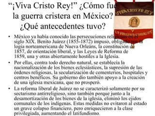La guerra cristera en México surgió en respuesta a las duras persecuciones religiosas implementadas por los gobiernos liberales mexicanos desde el siglo XIX. En 1926, el gobierno del general Plutarco Elías Calles endureció las leyes anticlericales, lo que provocó el levantamiento armado de campesinos católicos conocidos como cristeros para defender su fe. A pesar de estar mal equipados, los cristeros libraron una guerra de guerrillas contra el ejército federal durante varios años hasta que en 1929 el g