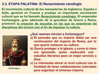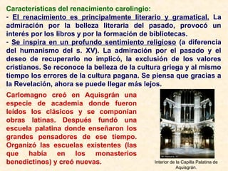 A) Carlomagno promovió la creación de escuelas para impulsar la cultura y tener colaboradores instruidos que organizaran su imperio. Esto dio lugar al Renacimiento carolingio. B) Juan Escoto Eriúgena fue un importante filósofo de este periodo que elaboró un sistema metafísico neoplatónico donde todas las cosas proceden y retornan a Dios a través de un proceso circular de creación y devolución. C) Si bien intentó conciliar la fe y la razón, su pensamiento fue considerado herético y su obra