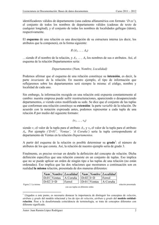El documento describe el modelo relacional de bases de datos. Este modelo representa la información en forma de tablas o relaciones, donde cada fila representa una tupla de valores relacionados. Las relaciones tienen atributos y esquemas que definen su estructura. El modelo incluye conceptos como claves primarias, valores nulos y restricciones de integridad para garantizar la consistencia de los datos.
