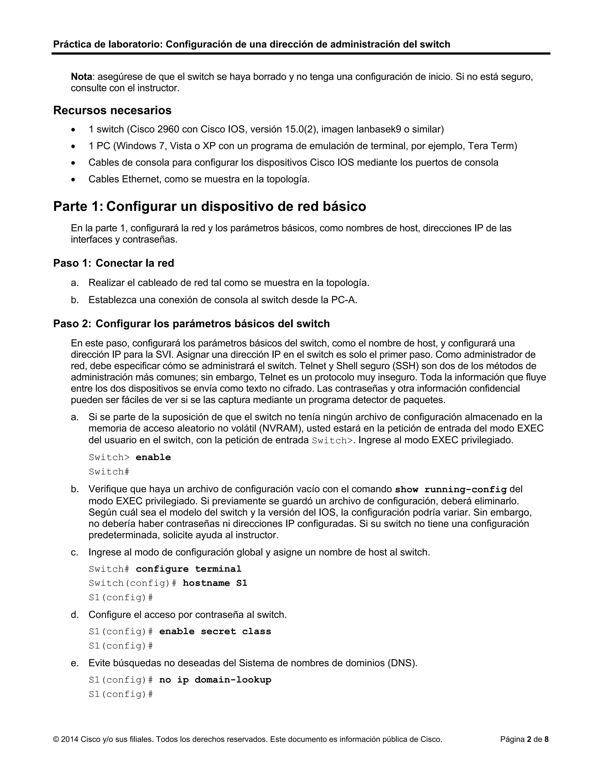 Este documento describe los pasos para configurar una dirección IP de administración en un switch Cisco. Se configurará una red simple con un switch y una PC. En la Parte 1, se configurarán los parámetros básicos del switch como el nombre de host, la dirección IP de la interfaz VLAN 1 y las contraseñas. En la Parte 2, se verificará la configuración mediante el comando "show run", se probará la conectividad ping entre el switch y la PC, y se probará el acceso Telnet remoto al switch.