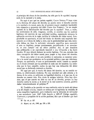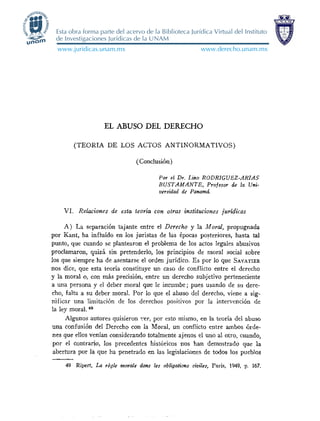 Este documento discute las relaciones entre la teoría del abuso de derechos y otras instituciones jurídicas como la moral, el fraude a la ley y los conflictos de derechos. Argumenta que aunque estos conceptos parecen similares, tienen diferencias importantes. Por ejemplo, el abuso de derechos implica el ejercicio indebido de un derecho subjetivo que causa daño a otro, mientras que el fraude a la ley involucra el uso inadecuado de la ley para violar otras normas legales. También señala que el