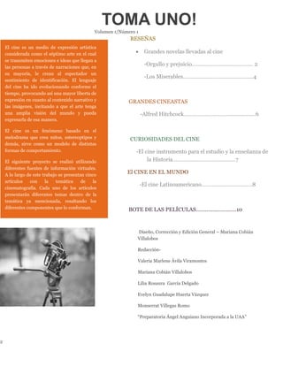 Este documento presenta cinco artículos sobre diferentes temas relacionados con el cine. El primer artículo analiza la novela Orgullo y prejuicio y su adaptación cinematográfica de 2005. El segundo examina la novela Los miserables y su llevada al cine. El tercero se enfoca en la vida y obra del director Alfred Hitchcock. El cuarto explora el potencial del cine como herramienta educativa para la enseñanza de la historia. El quinto y último artículo discute el cine latinoamericano.