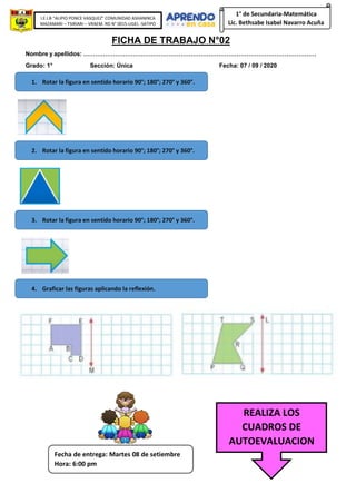 Este documento presenta una lección sobre transformaciones geométricas como rotaciones y reflexiones. La maestra introduce el tema y explica brevemente las rotaciones y reflexiones. Luego, asigna una tarea que incluye rotar y reflejar figuras geométricas. Finalmente, proporciona una autoevaluación y reflexión para los estudiantes.