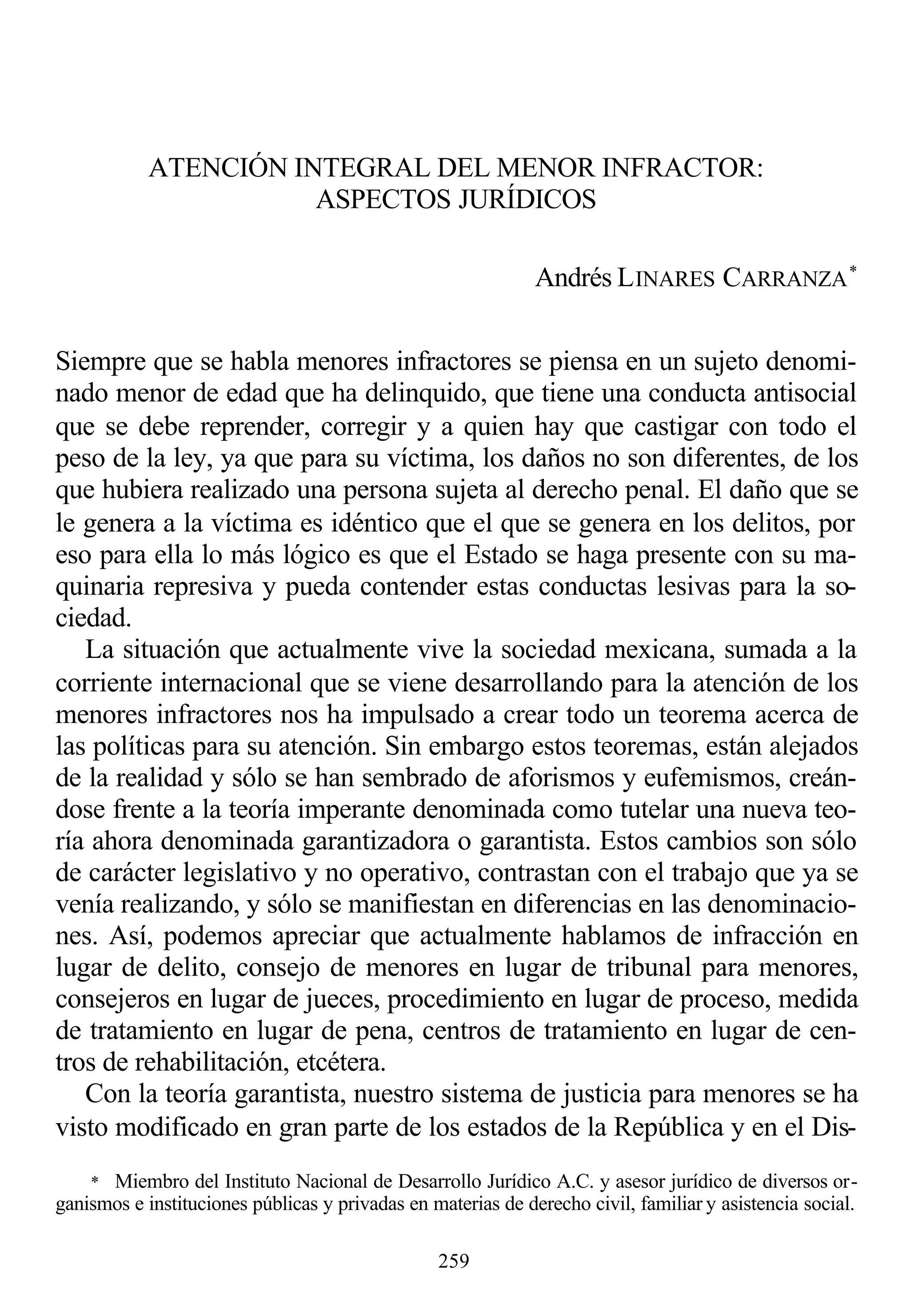 El documento discute la necesidad de un enfoque integral para abordar la atención de menores infractores en México. Actualmente, el sistema se ha vuelto más complejo y ha perdido eficacia al alejarse de las tradiciones jurídicas mexicanas y del trabajo previo. Se requiere una estrategia que considere aspectos del derecho penal, familiar, administrativo y asistencial para comprender las causas de la conducta antisocial y brindar soluciones integrales en lugar de sólo métodos sancionadores.