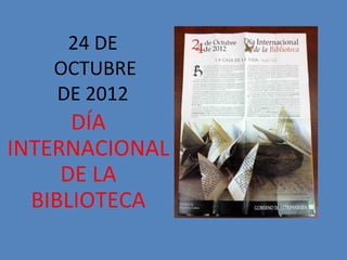 Este documento conmemora el Día Internacional de la Biblioteca resumiendo la historia de las bibliotecas desde sus orígenes. Comienza describiendo cómo los primeros humanos comenzaron a escribir pictogramas para identificar a reyes y guerreros, y cómo el saber se almacenaba originalmente en templos. Luego explica cómo los escritos pasaron a almacenarse en papiros, pergaminos y bibliotecas públicas en la antigua Grecia. Finalmente, elogia a las bibliotecas modernas al señalar que los ant