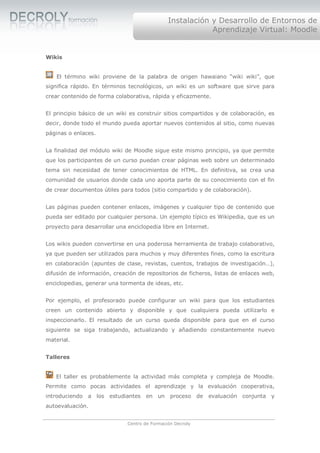El documento describe diferentes módulos colaborativos en Moodle como foros, wikis, talleres y bases de datos. Los foros permiten comunicación asíncrona entre participantes, mientras que las wikis permiten creación colaborativa de contenido de forma rápida. Los talleres facilitan aprendizaje y evaluación cooperativa mediante la revisión y evaluación de trabajos de otros estudiantes.