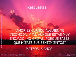 Los niños describen el amor de diferentes formas, incluyendo cuando alguien te incomoda pero no gritas para no herir sus sentimientos, cuando cuidas a otra persona a pesar de tener limitaciones físicas, y cuando compartes comida u ofreces cumplidos sin esperar nada a cambio.