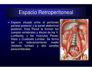 Este documento describe la anatomía del espacio retroperitoneal y sus estructuras. En el espacio retroperitoneal se encuentran los grandes vasos como la aorta y la vena cava, el sistema nervioso simpático lumbar, y el sistema linfático. También contiene órganos como los riñones y las suprarrenales. El documento proporciona detalles sobre la anatomía de estas estructuras y sus relaciones.