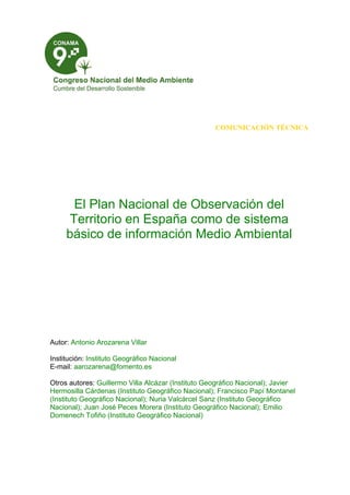 El documento describe el Plan Nacional de Observación del Territorio en España (PNOT), el cual tiene como objetivo obtener información actualizada, coordinada y compatible sobre el territorio español mediante imágenes aéreas y de satélite. El PNOT busca mejorar la eficiencia de recursos al evitar duplicidades, compartir información entre administraciones, y satisfacer los requisitos de la Unión Europea e instituciones. Los principales organismos participantes incluyen varios ministerios y comunidades autónomas.