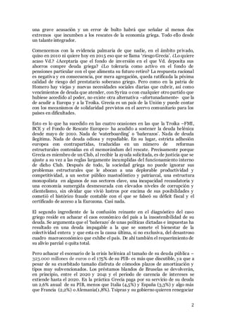 El documento discute el reciente comentario del ministro de finanzas griego Yanis Varoufakis describiendo los programas de rescate de la Troika como "waterboarding", o "bañerazos". El autor argumenta que (1) los préstamos de la Troika no constituyen una "deuda ilegítima" sino que son parte de la solidaridad europea, y (2) la crisis griega se debe más a problemas estructurales a largo plazo en la economía griega que al tamaño de su deuda. El autor predice que Grecia y sus acreedores llegar